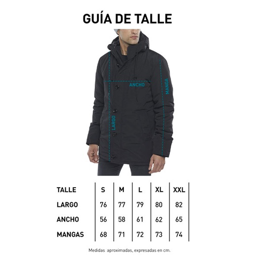 Taslon. 100% Nylon. Tratamiento repelente al agua. 75D. Interior matelase. Tapa cierre frontal con botones al tono. Cierre dientes de perro plástico. Bolsillo frontal con tapacierre. Capucha con cordón y tancas de ajuste. Producto importado.