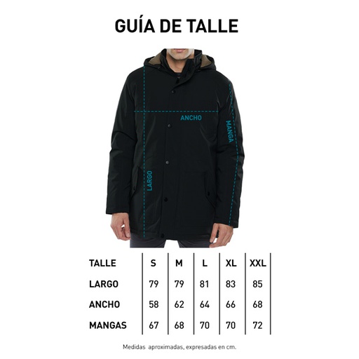 Twill. 100% Poliéster. Interior matelasé. Tratamiento repelente al agua T400W. Tapacierre frontal. Cierre y snaps metálicos. Bolsillos frontales. Capucha con cordón. Producto importado.